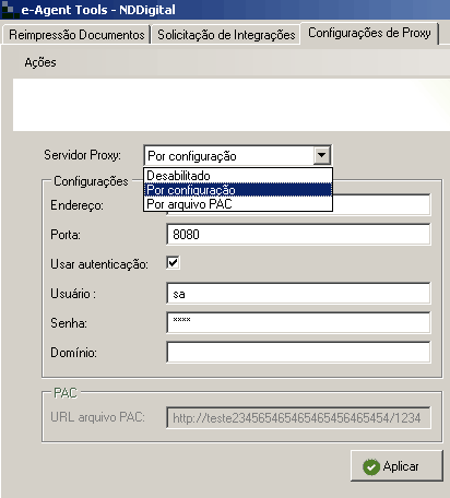Caso o ambiente utilize de proxy PAC, selecione a opção “Por Arquivo PAC”, e informe a URL.