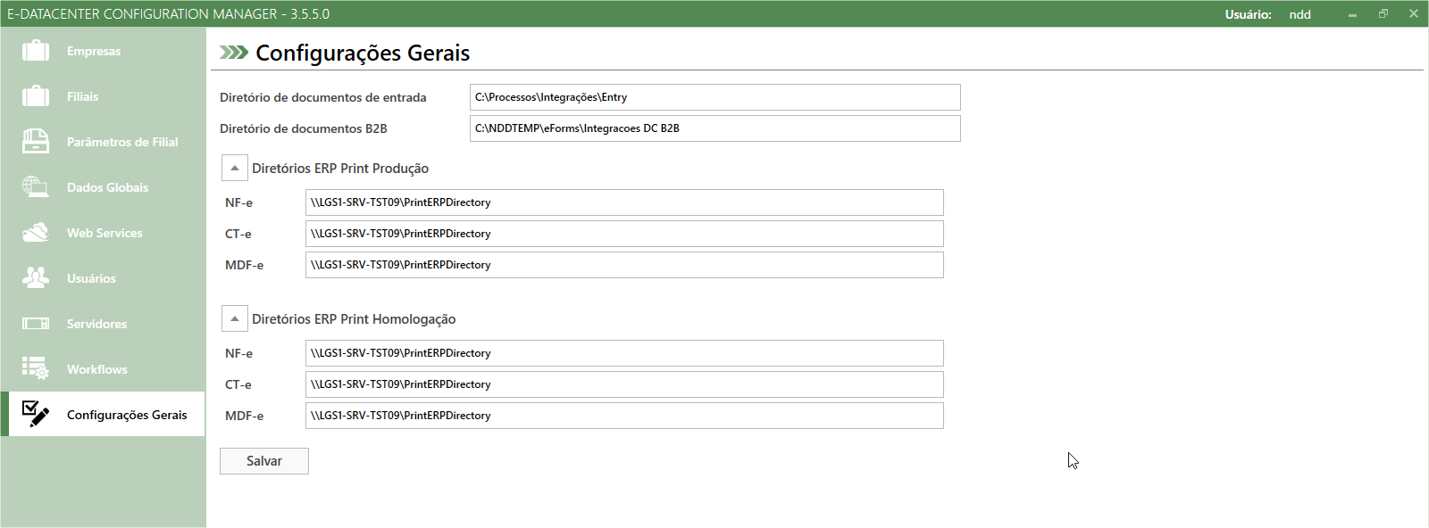 •Diretório de Docuemento de Entrada: Preencher com o caminho onde o serviço do DataEntry Service irá capturar as integrações de documentos de entrada processados pelo e-Forms; •Diretório de Documentos B2B: Preencher com o caminho onde o serviço do e-Datacenter B2B Service irá capturar os arquivos B2B Directory (XML / PDF) gereados pelo e-Forms. •Diretório ERP Print Servece NF-e: Indicar o diretório de processamento do ERP Print do ambiente de NF-e. •Diretório ERP Print Servece CT-e: Indicar o diretório de processamento do ERP Print do ambiente de CT-e. •Diretório ERP Print Servece MDF-e: Indicar o diretório de processamento do ERP Print do ambiente de MDF-e.