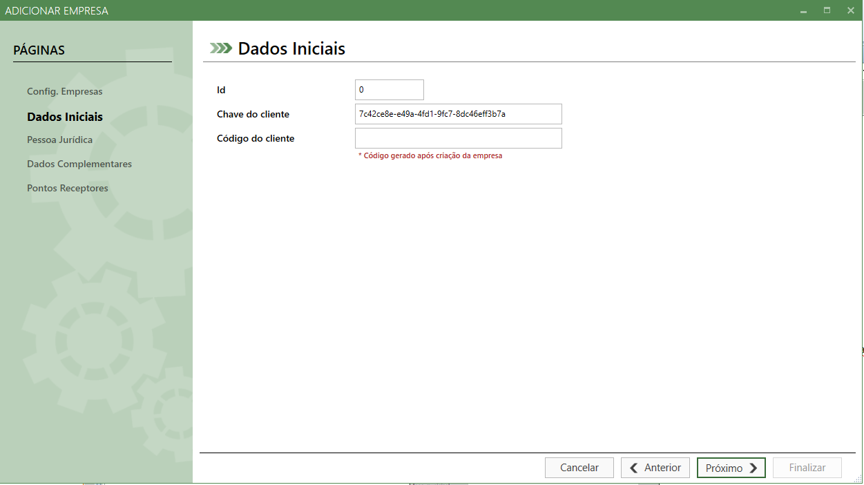Obs.: O campo Código do Cliente não estará preenchido, sendo o mesmo gerado apenas após a conclusão do cadastro da empresa. O mesmo ficará visível ao usuário ao editar a empresa criada.