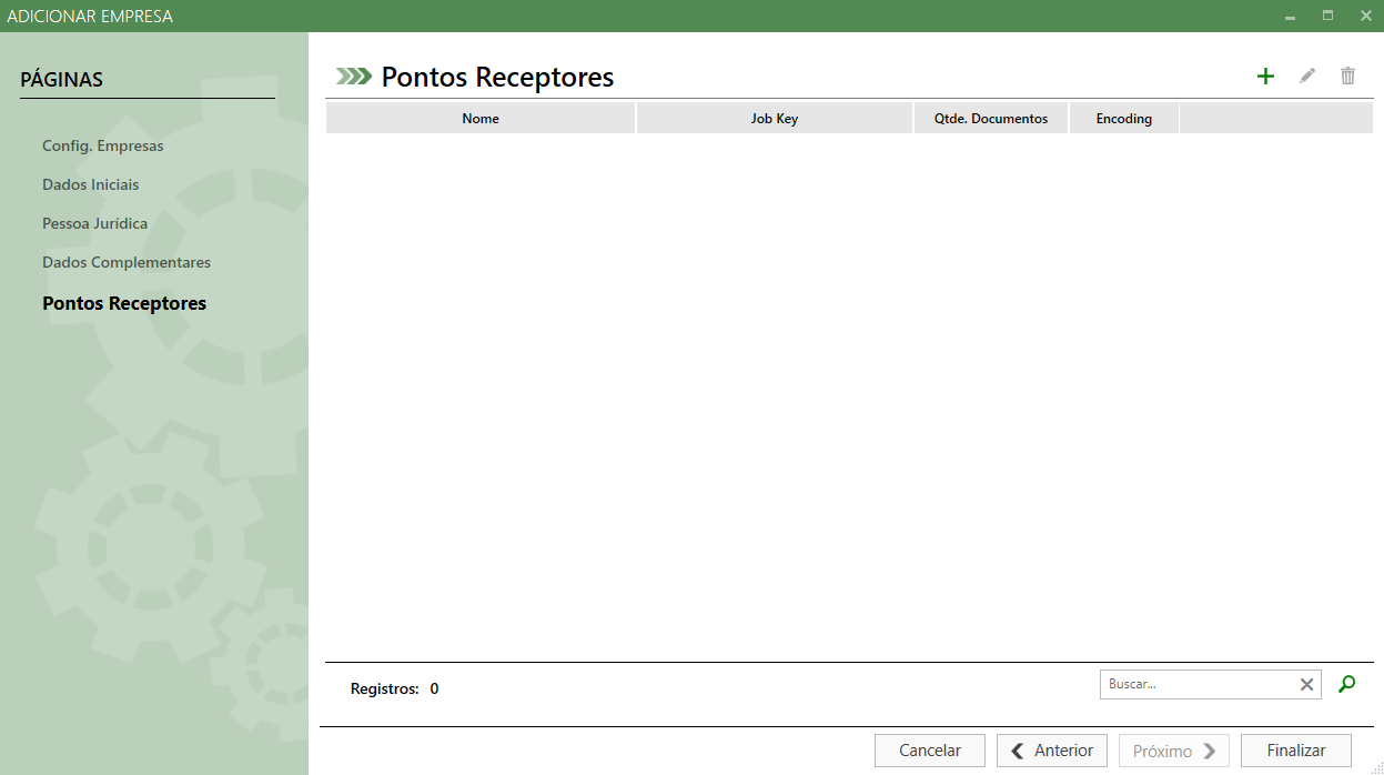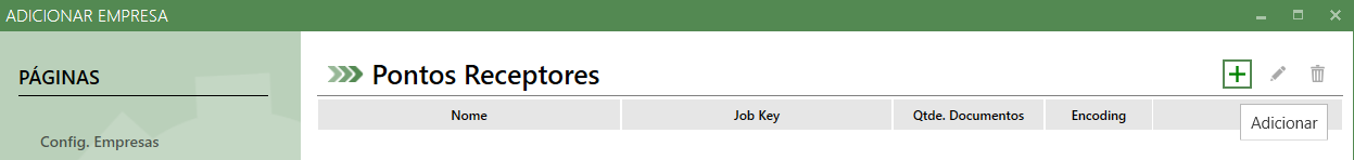 Nesta tela será apresentado o cadastro de pontos receptores, onde serão armazenadas as integrações de Notas de entrada e realizado o envio de evento de manifesto de destinatário. Para adicionar um ponto receptor clique no botão adicionar: