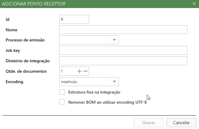 ▪Nome: Informar o nome do ponto receptor, este nome será utilizado para criar o diretório no e-Agente Dataentry; ▪Processo de emissão: Selecionar o tipo de documento que será recebido, podendo ser (NF-e, CT-e ou MDF-e). ▪JobKey: Informar a chave do ponto receptor, esta chave será utilizada como identificador único do ponto, e deverá ser informado nos cadastros dos seguintes campos; ▪Diretório de Integração: Permite configurar um caminho onde serão geradas as integrações de documentos de entrada no e-Agente, abaixo algumas regras para utilização dessa funcionalidade: ✓O preenchimento desse campo é opcional; ✓Não preenchendo o mesmo as integrações serão geradas no diretório padrão do Ponto Receptor; ✓Caso o diretório não exista no e-Agente, o mesmo será criado de forma automática pela solução. ✓Caso o caminho seja inválido ou não possua permissão de escreita, as integrações deverão ser geradas no diretório padrão do Ponto Receptor (Processo padrão). ▪Quantidade de Documentos: Informar a quantidade de documentos integrados por vez no Ponto Receptor; ▪Encoding: Informar o tipo de codificação utilizada pelo arquivo; ▪Estrutura fixa na integração: Com essa opção habilitada as integrações serão geradas no diretório Integration sem levar em consideração a data do processo, caso contrário será gerada uma estrutura de subdiretórios para gerar as integrações de acordo com a data do processo EX.: RAIZ:\Program Files\NDDigital\e-Agente\DataEntry\<PONTO RECEPTOOR>\integration\2016-04-11 ▪Remover BOM ao utilizar enconding UTF-8: Realiza a remoção do BOM quando utilizado encoding UTF-8.