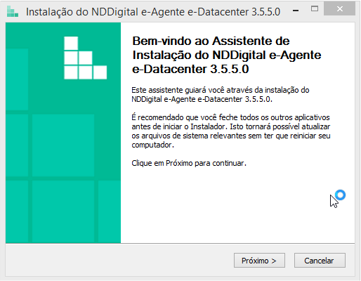 Passo 1: Execute o instalador com um duplo clique no ícone e-Agente.exe, iniciando-o. A tela abaixo será exibida, clique em “Próximo” para continuar.