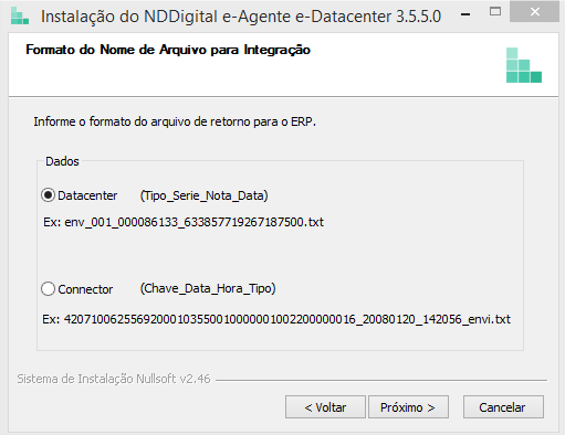 Passo 4: Selecione a opção do formato do arquivo de integração. A opção “Datacenter” retornará a integração com o formato: <Tipo>_<Série>_<Nota>_<Controle>