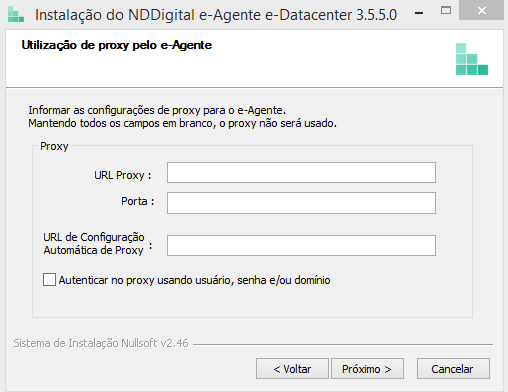Esta opção só deverá ser utilizada se for necessária conexão com um servidor de Proxy para se comunicar com a internet. Se for marcada a opção para utilizar Proxy, serão abertas as telas de configuração.
