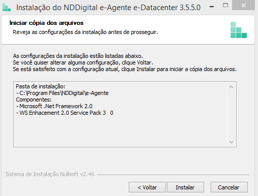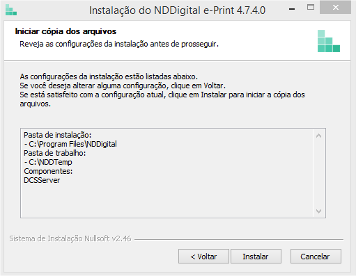 Passo 12: Resumo das configurações escolhidas nas fases anteriores e os componentes de software que serão instalados. Caso esteja tudo configurado como desejado, clique em “Avançar”. Para alterar alguma configuração clique em “Voltar”.