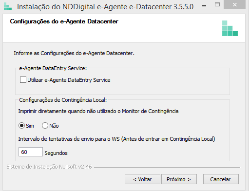 Passo 7: Defina algumas configurações do e-Agente DataCenter, como a utilização dos DataEntry marcando a opção "Utilizar e-Agente DataEntry Service" e configuração de contingência local;