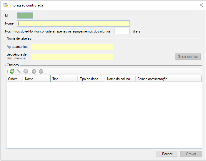 Os campos Grupo e Sequência são obrigatórios, porém os campos Contador e Filtro são opcionais, entretanto, quando configurados os respectivos campos em Impressão Controlada deve conter no campo Nome e na massa de dados a mesma informação, respeitando as letras maiúsculas e minúsculas, ou seja, o nome configurado deve ser igual ao que consta na linha 10300. |