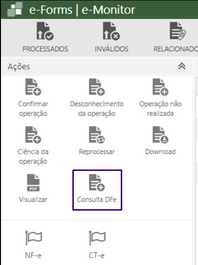 A ação Consulta DF-e tem como principal função realizar o envio do evento (constChNFe) para o documento de entrada de NF-e por meio do portal Web e-Monitor. Esse processo viabiliza a confirmação da entrada do documento no sistema, a integração com o ERP e o armazenamento em Cold.