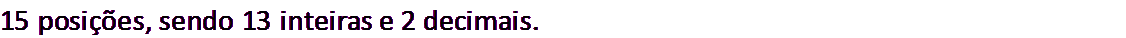 15 posições, sendo 13 inteiras e 2 decimais. |