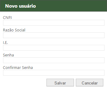 c. Após clicar em "Novo usuário", deve-se informar o CNPJ, Razão Social, Inscrição Estadual e definir uma Senha para a empresa ser cadastrada e confirmar a mesma senha. Após preencher todos os campos, deve-se clicar em “Salvar”. É permitido apenas um cadastro por CNPJ.
