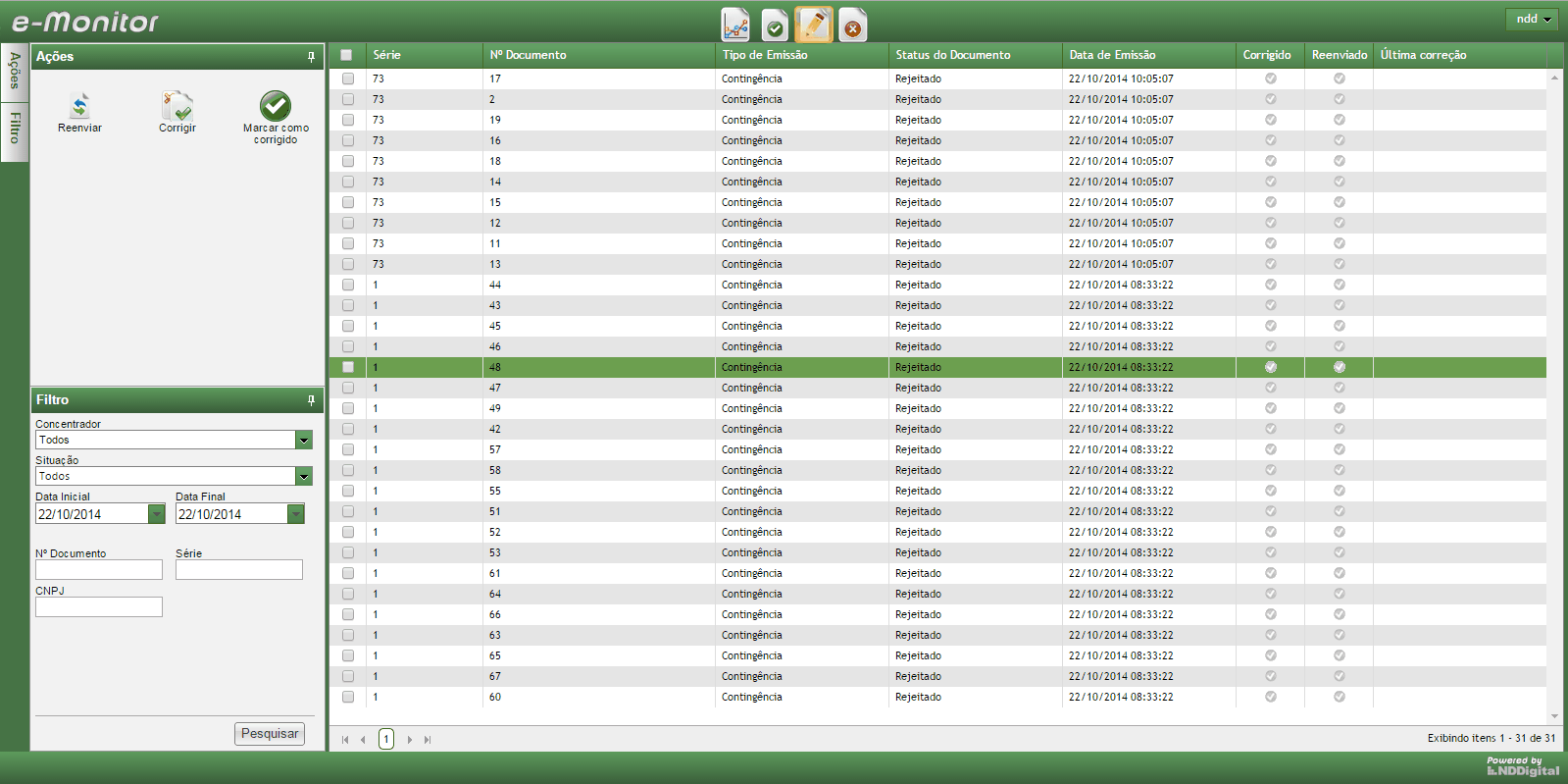 Nesta aba serão exibidos todos os documentos Rejeitados aptos a serem corrigidos, desque que o usuário tenha a devida permissão no Connector Settings.