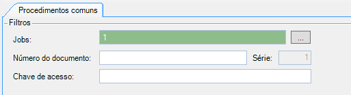É com base nos campos de filtro que são executadas todas as operações disponíveis para lotes e documentos em Procedimentos comuns. O único campo de preenchimento obrigatório é o Job. Os campos Número do documento e Chave de acesso nunca poderão ser preenchidos juntos, deve-se escolher entre um dos dois para pesquisar documentos.