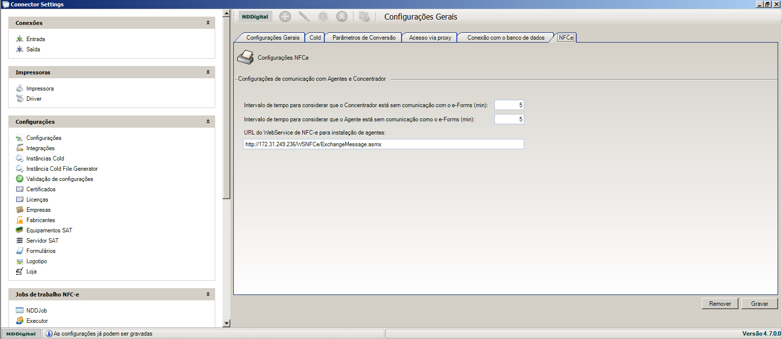 d. Intervalo de tempo para considerar que o Agent está sem comunicação com o e-Forms(min). e. URL do Web Service de NFC-e para instalação de Agentes: Nesse espaço será cadatrado o endereço do Web Service da solução para geração de pacotes padrão. f. Clique no botão