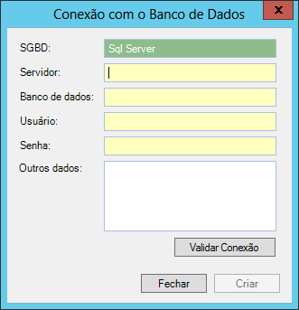 e.Selecione o Sistema Gerenciador de Banco de Dados que será utilizado. Em seguida clique no botão Criar para especificar os dados de conexão com o banco que será utilizado. Então, a tela abaixo será exibida: