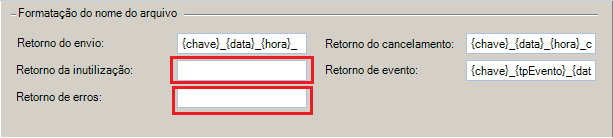 Formatação do nome do arquivo: nome que será dado aos arquivos de retorno do envio, retorno da inutilização, retorno de erros, retorno de evento. O nome do arquivo pode receber três parâmetros para diferenciá-lo, são eles: chave de acesso {chave}, data de envio {data}, hora de envio {hora} o tipo de evento {tpEvento} é o parâmetro utilizado somente para retorno de eventos. Também é possível utilizar uma literal no final ou no início desses arquivos.