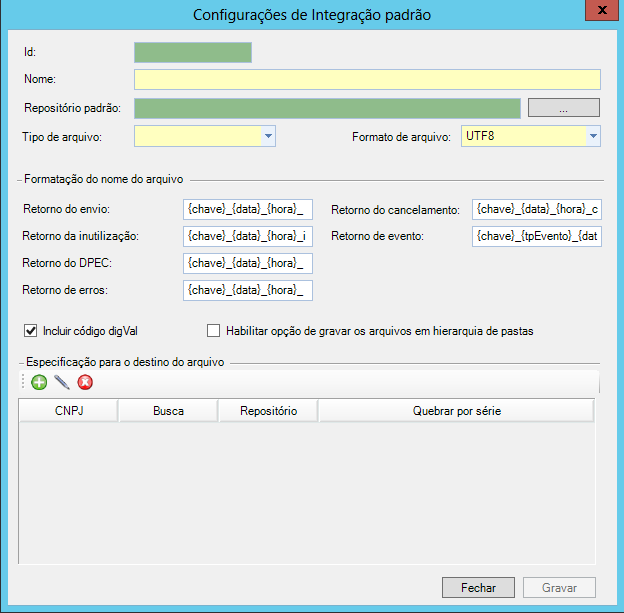 Configuração de integração baseada em arquivo os campos são opcionais, caso o cliente deseje não receber algum tipo específico de arquivo de integração, basta salvar sua configuração de nomenclatura em branco.