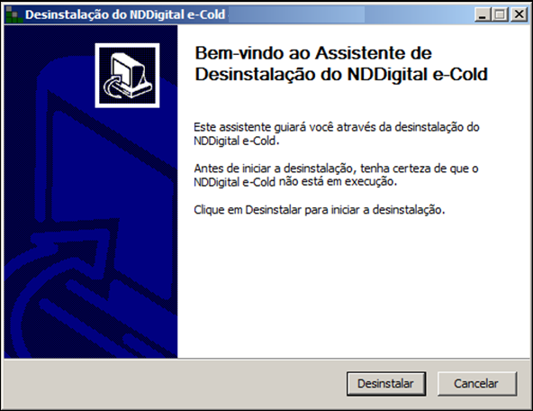 Passo 1: Tela inicial da desinstalação do e-Cold. Para prosseguir, clique em Desinstalar.