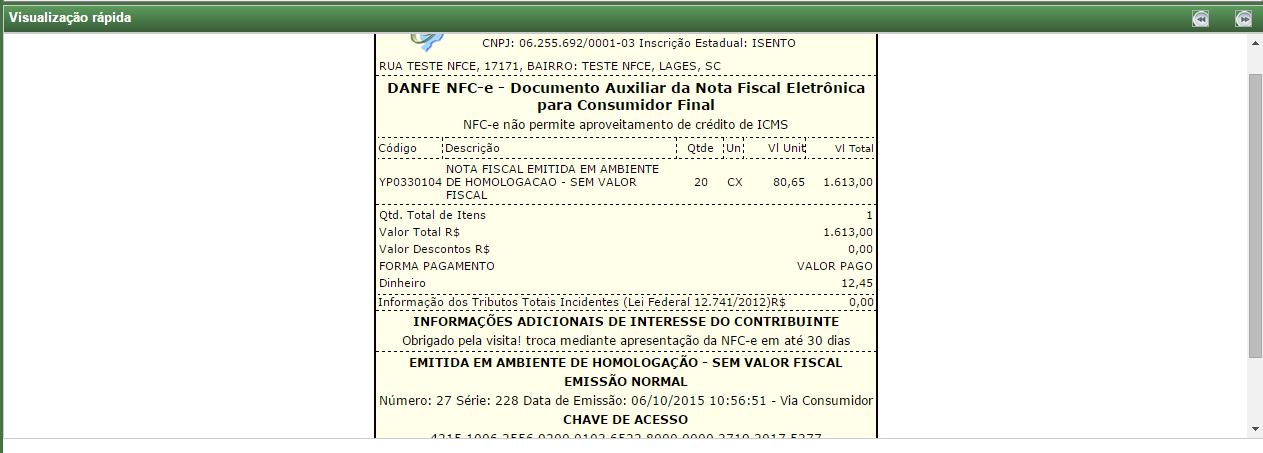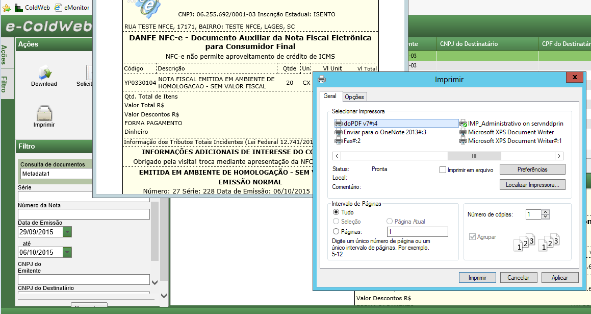 A impressão de notas pelo Cold Web segue por padrão as informações contidas na visualização rápida: