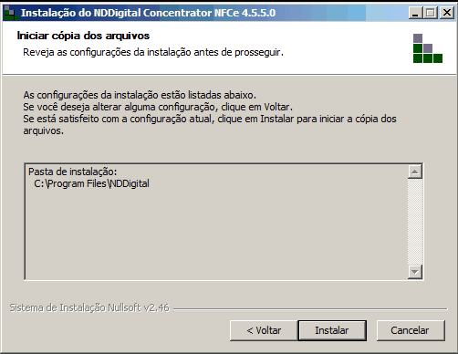Passo 6: As configurações realizadas são listadas antes de iniciar a instalação. Reveja as configurações, caso deseje alterar alguma delas, clique em voltar. Se todos os parâmetros configurados estiverem de acordo com o desejado, clique no botão Instalar para iniciar a instalação do produto.