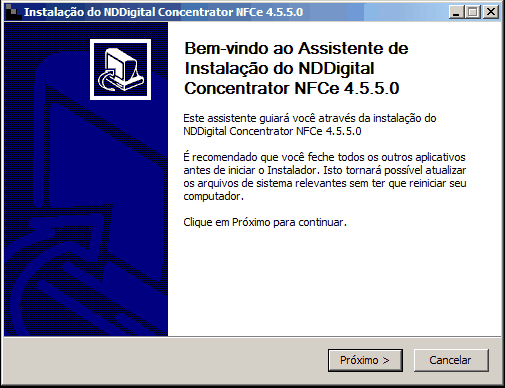 Passo 2: O instalador do Concentrador NFC-e faz a verificação de todos os componentes que são pré-requisitos para o seu funcionamento, caso detecte algum, apresenta mensagem informando que é necessário instalar o pré-requisito para iniciar a instalação. Após todos os pré-requisitos conferidos, é permitido instalar o Concentrador. Será exibida a tela inicial do instalador, clique em Próximo:
