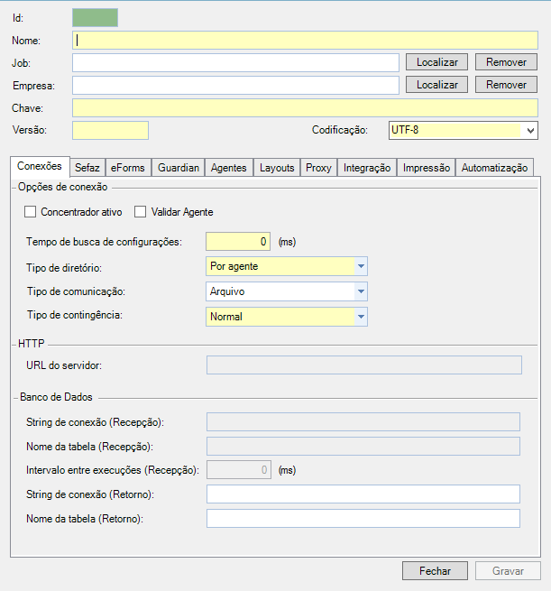 String de Conexão (Recepção): Informações do Banco de Dados, isso é para o caso de tipo de comunicação for via Banco de Dados.