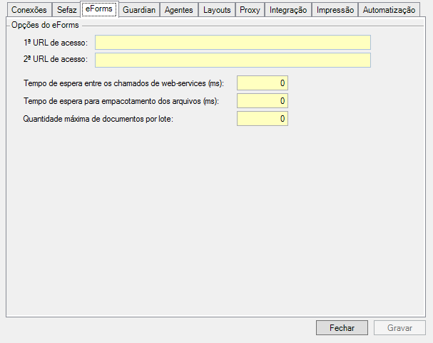 Tempo de espera para empacotamento dos arquivos (ms): Tempo para realizar os empacotamentos dos arquivos para envio para o e-Forms NFC-e.