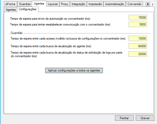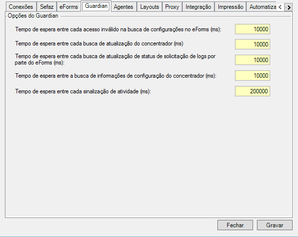 Tempo de espera entre cada busca de atualização de status de solicitação de logs por parte do e-forms (ms): Tempo para as solicitações de logs para envio para o e-forms, logs do concentrador para poder ser analisado no e-forms NFC-e.