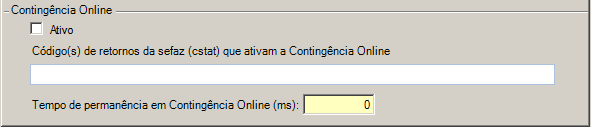 Ativo: Ao marcar essa opção, os campos abaixo referentes à Contingência Online estarão disponíveis para preenchimento. Logo a função estará ativa. Código(s) de retornos da sefaz (cstat) que ativam a Contingência Online: Neste campo serão adicionados os códigos de retorno que serão tolerados para que tanto o Concentrador quanto o Agente entrem na Contingência Online. Tempo de permanência em Contingência Online (ms): Este campo servirá para configurar o tempo em que o Concentrador/Agente permanecerá em Contingência Online.