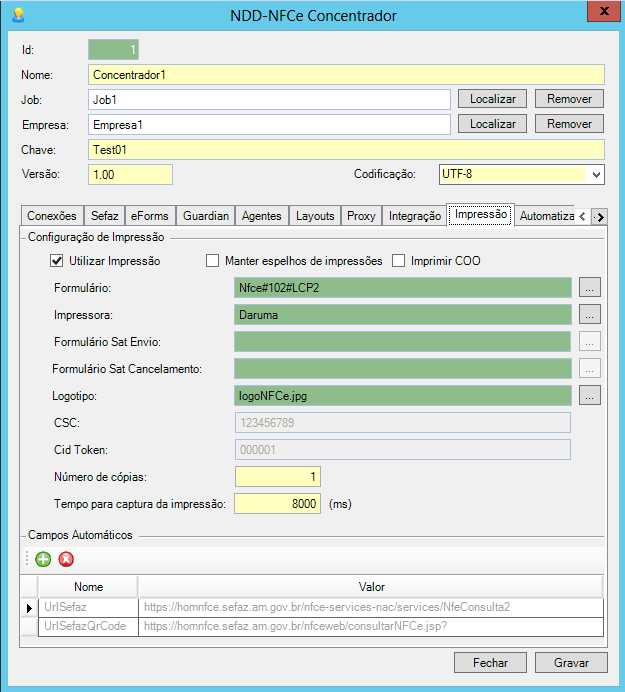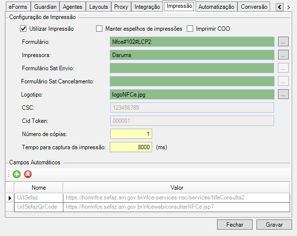 CSC: Campo que deverá ser preenchido com o Código de Segurança do Contribuinte. Cid Token: Campo que deverá ser preenchido com Cid Token do Contribuinte. Número de Cópias: Quantidade de cópias que deverão ser impressas de cada nota processada. Tempo para captura da impressão: Esse campo deve disponibilizar parâmetro no concentrador para realizar o controle de intervalo de impressão. Possui o valor mínimo de 8000 ms (8 segundos). Campos Automáticos: Deverão ser adicionados aqui os campos automáticos que saíram nas notas impressas.