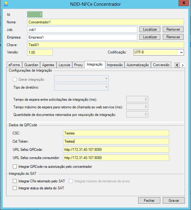 Integrar QRCode na autorização pelo Concentrador: Ao marcar esse checkbox o cliente deverá inserir as informações do QRcode que sairá impresso nas notas manualmente. Após preencher todos os campos, o botão gravar estará disponível. Essa opção por padrão virá desmarcada.