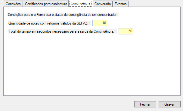 20.Na aba Contingência informamos o tempo e quantidade de notas que o e-Forms NFC-e vai mandar para o web Service Síncrono, para obter um retorno válido para tirar o concentrador do modo de contingência.