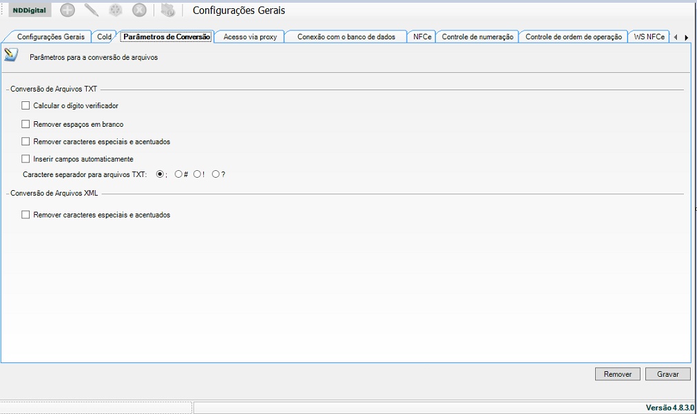 Remover caracteres especiais e acentuados: deverá ser utilizada quando é necessário remover do arquivo texto, caracteres acentuados, sendo substituídos por seu correspondente sem acento e/ou retirar do texto caracteres especiais como “º”, “ª”, entre outros, que podem danificar o arquivo XML no padrão UTF-8.