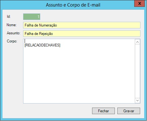 Nome: Basicamente o nome pelo qual esse registro será encontrado e identificado; Assunto: Nome pelo qual o registro será identificado quando necessário escolher algum "Assunto"; Corpo: Conteúdo do e-mail que será enviado e vinculado na Empresa.