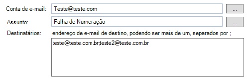 Conta de e-mail: Conta a ser configurada que será utilizada para efetuar o envio; Assunto: Assunto padrão que deverá ser cadastrado; Destinatários: Endereço de destino do e-mail, podendo ser mais que um, separados por ;)