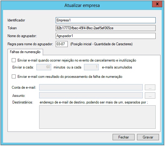 Identificador: Informe o nome da empresa que deseja cadastrar. Token: Ao cadastrar uma empresa o e-forms NFC-e cria automaticamente um Token para controle de cadastro. Nome do agrupador: Esse nome será utilizado para visualização do Dashboard no monitor (Ex: Loja, Filial, Departamento). Regra para nome do agrupador: Nesse campo conterá a posição inicial e tamanho do campo que deverá ser extraído do identificador (chave do e-agente) disponibilizado na tabela de entrada (tbdatabaseinput). (Ex: 5-10).