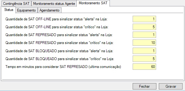 Quantidade de SAT BLOQUEADO para sinalziar status "alerta": Neste campo o usuário determinará a quantidade de SAT's Bloqueados para sinalizar no e-monitor o status alerta. Quantidade de SAT BLOQUEADO para sinalziar status "crítico": Neste campo o usuário determinará a quantidade de SAT's Bloqueados para sinalizar no e-monitor o status crítico.