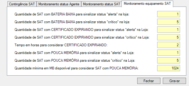Quantidade de SAT com CERTIFICADO EXPIRANDO para sinalizar status alerta: Neste campo o usuário determinará a quantidade de equipamentos SAT com CERTIFICADO EXPIRANDO para sinalizar no e-monitor o status alerta. Quantidade de SAT com CERTIFICADO EXPIRANDO para sinalizar status crítico: Neste campo o usuário determinará a quantidade de equipamentos SAT com CERTIFICADO EXPIRANDO para sinalizar no e-monitor o status crítico. Tempo em HORAS para considerar CERTIFICADO EXPIRANDO: Neste campo o usuário determinará o tempo em HORAS para considerar o certificado utilizado como expirando.