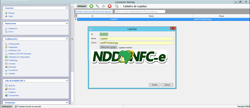 Nome: Nome do Logotipo que será utilizado posteriormente para impressão. Chave: Nome da chave correspondente ao Logotipo. Selecionar Logotipo: Deverá ser localizado o logotipo de sua preferência para impressão. Após escolher clique em Abrir e logo depois em Gravar.