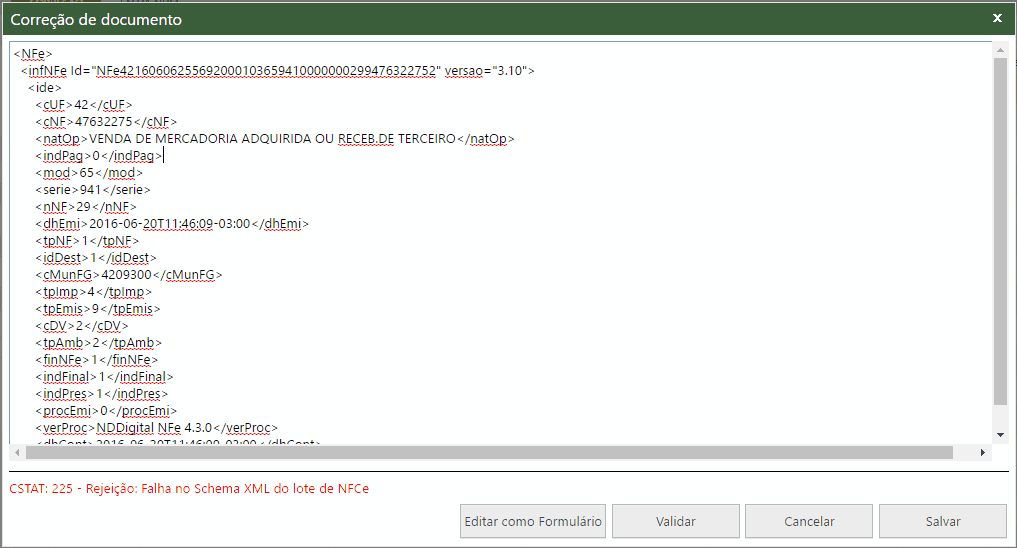 Nessa opção surgirá em modelo de formulário todos os campos da nota enviada, e abaixo informando qual o erro em específico. Após a correção basta o usuário clicar em Validar Documento para verificar se algo mais está errado e por fim, clicar em Salvar e a nota estará corrigida.