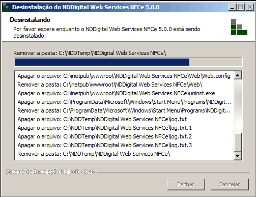 Passo 2: Progresso da Desinstalação: Será mostrado o progresso da desinstalação do Web Services.