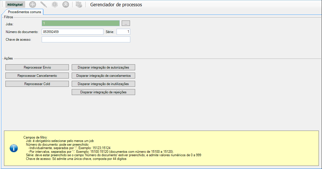 Esta ferramenta auxiliará aos usuários a acompanhar o andamento dos processos na base do Connector e também executar algumas ações comuns sobre estes processos, as quais geralmente são executadas pelo suporte NDDigital, como reprocessar algum documento ou adiar algum tipo de processo. Estas operações estão disponíveis tanto para NFC-e.
