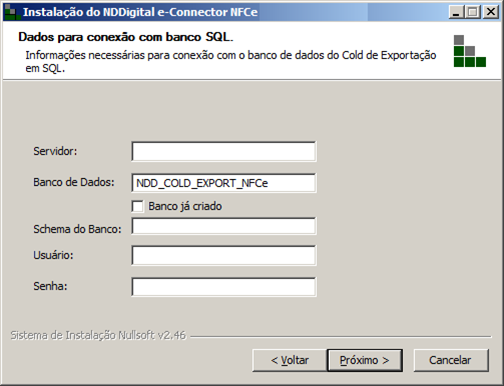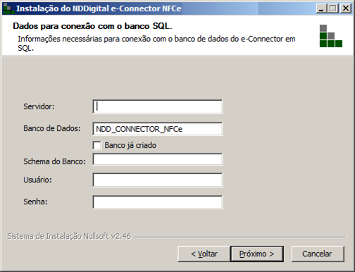 Opção “Banco já Criado”: esta opção será marcada quando a criação da base de dados de processamento do e-Connector NFC-e for realizada através de script DDL, executado pela equipe responsável por manter o servidor de banco de dados no cliente;