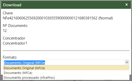 Passo 2: Após acionar a ação Download, será exibida a tela Download do documento para selecionar o formato em Documento Original NFCe, Documento NFCe ou Documento processado (nfeProc). Selecione a opção desejada e clique em Download, será apresentada uma nova janela para salvar o arquivo.