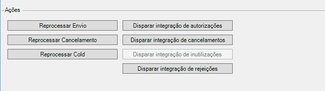 •Disparar integração de autorizações: procura na base os processos de envio finalizados e dispara a integração destes documentos para o ERP. Essa operação pode ser feita com o serviço do Connector rodando. •Disparar integração de cancelamento: procura na base os processos de cancelamento finalizados e dispara a integração destes documentos para o ERP. Essa operação pode ser feita com o serviço do Connector rodando. •Disparar integração de inutilizações: procura na base os processos de inutilização e CAN-INU finalizados e dispara a integração destes documentos para o ERP. Se o campo Chave de acesso do filtro estiver preenchido este botão ficará desabilitado, pois para buscar as inutilizações homologadas deve-se utilizar o filtro de número de documento. •Disparar integração de rejeições: procura na base os processos de rejeição e dispara a integração destes documentos para o ERP. Essa operação pode ser feita com o serviço do Connector rodando.