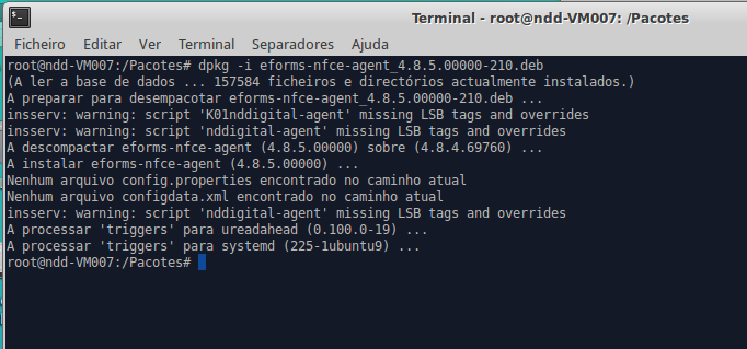 Passo 2: Após salvar o arquivo .deb em um determinado repositório do servidor, executar o mesmo no terminal com o comando abaixo: Exemplo do comando: dpkg -i eforms-nfce-agent-4.8.5.00000.deb