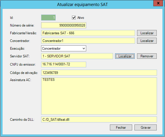 Caminho da DLL: Caminho da pasta raíz de onde se encontra a DLL "dllsat.dll".
