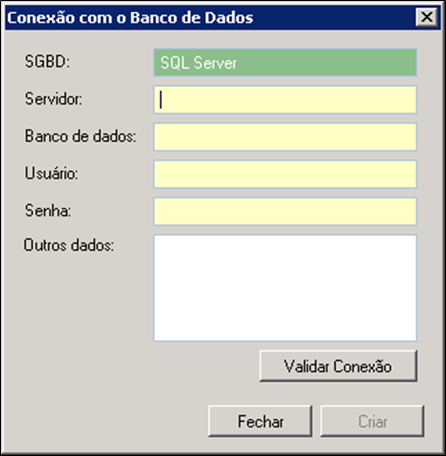 g.Clique no botão Criar para especificar os dados de conexão com o banco que será utilizado. A tela abaixo será exibida: