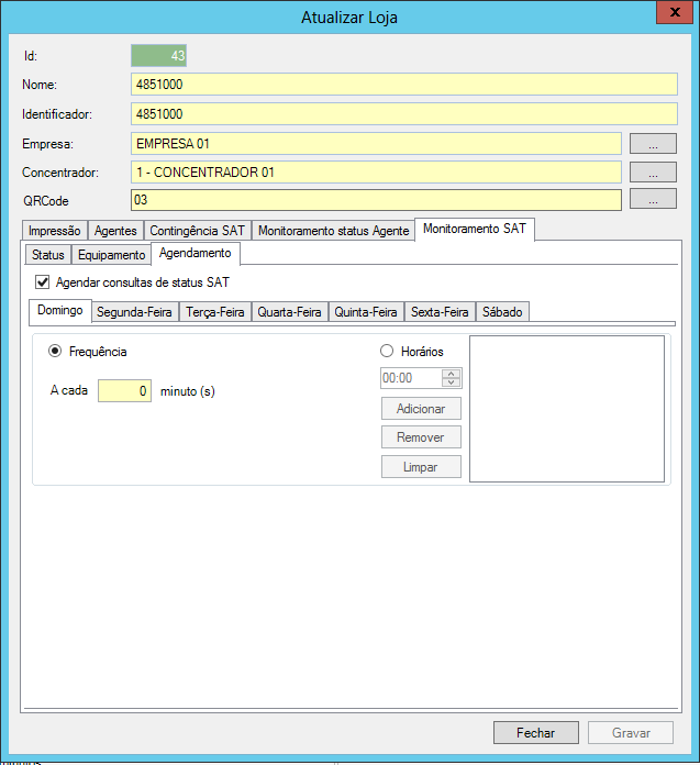 Agendar consultas de status SAT: Com esse checkbox marcado, as configurações de agendamento estarão disponíveis para cadastramento.