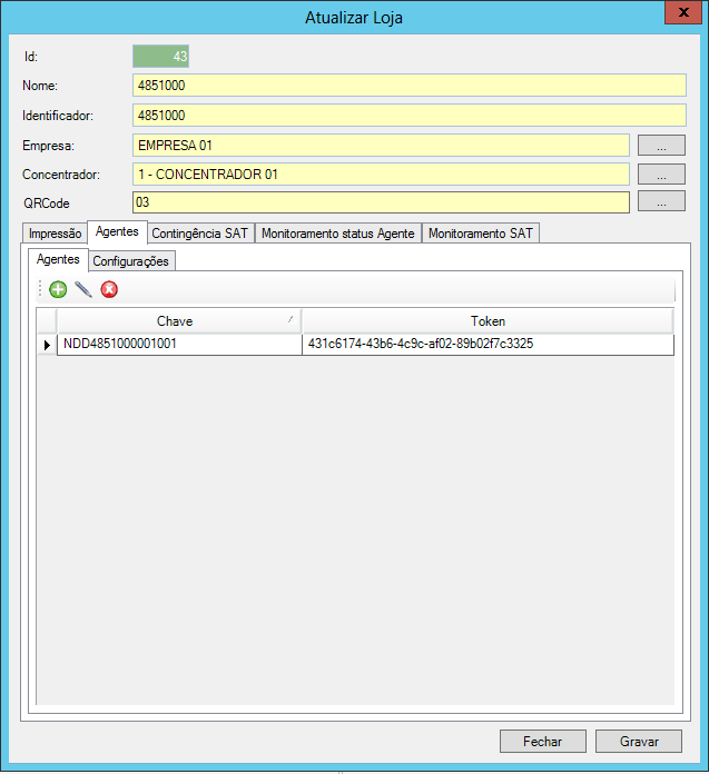 •Chave: A chave é basicamente o nome do agente, determinado no arquivo que é enviado pelo PDV. •Token: Para cada Agente é Gerado um token automaticamente. •Codificação: Escolha uma das Codificações para o Agente utilizar ao processar os documentos eletrônicos.