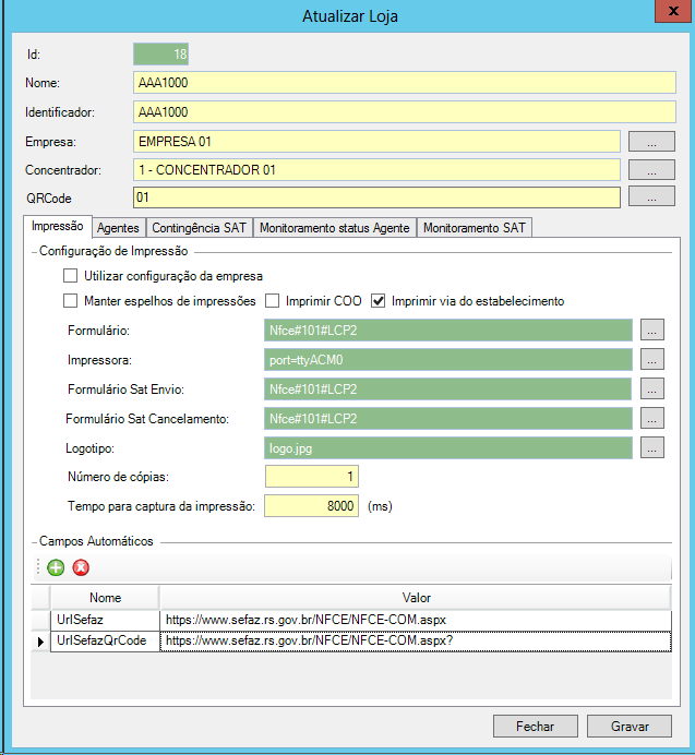 •Utilizar configuração da loja: Selecionando este campo, os demais dados referente a impressão serão importados da loja que o agente pertence.